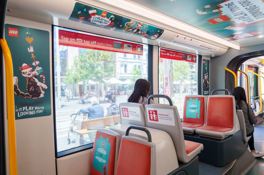 LEGO is bringing Christmas to the streets of Sydney with their festive Triple Carriage Wrap and Interior Domination across the Sydney Light Rail. Asking their audience “Is it play you’re looking for?” LEGO is inspiring Sydneysiders to consider LEGO this gifting season. Utilising a market-first special build, seat decals further extend the campaign, bringing various LEGO scenarios to life and guarantee visibility in a high-dwell environment.