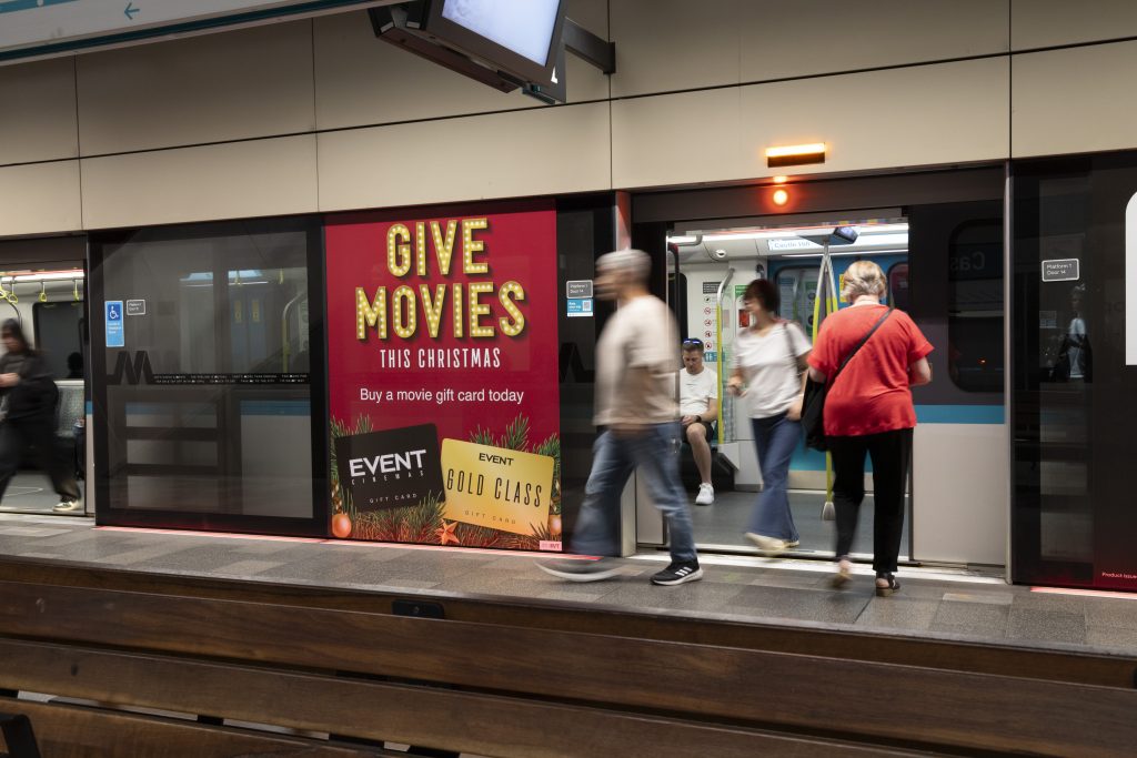 Event Cinemas is encouraging Sydney Metro commuters to “Give Movies” this gifting season with Portraits and an Interior Takeover. This Christmas themed creative stands out with eye-catching red, capturing attention in high-dwell locations. The campaign speaks to busy people on the go who can appreciate the convenience of gift cards, while also targeting those in close proximity to Event Cinemas located in Castle Hill, Macquarie and the CBD.